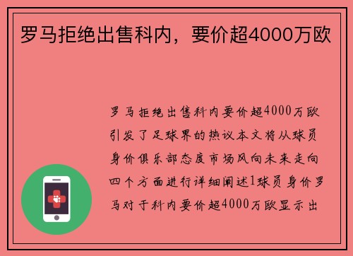 罗马拒绝出售科内,要价超4000万欧,引发了足球界的热议。本文将从球员身价、俱乐部态度、市场风向、未来走向四个方面进行详细阐述。 1、球员身价 罗马对于科内要价超4000万欧,显示出了他们对这位年轻...