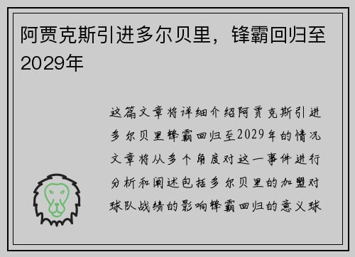 这篇文章将详细介绍阿贾克斯引进多尔贝里,锋霸回归至2029年的情况。文章将从多个角度对这一事件进行分析和阐述,包括多尔贝里的加盟对球队战绩的影响、锋霸回归的意义、球队未来的发展方向以及对球迷的影响等方...
